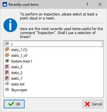 This dialog allows you to quickly select for a certain operation some of the project items you used most recently. Many important Reconstructor® functions need to have project items as input. For example, the function “Registration” needs two grid point clouds as input. You can start these functions by taking care of selecting the input items first, in the project window. However, this dialog offers you an alternative and in some cases more efficient way of starting your functions. If you start a function that needs items of a certain type as input, and none of these items is selected, then the dialog pictured above pops up to help you. The peculiar feature of this dialog is that it shows you the candidate items for your function, listing them from the most recently used to the least. If you are working repeatedly around few items, using this dialog might be more efficient than scrolling each time the project window that may easily contain hundreds of items. See also project items, and project window. |