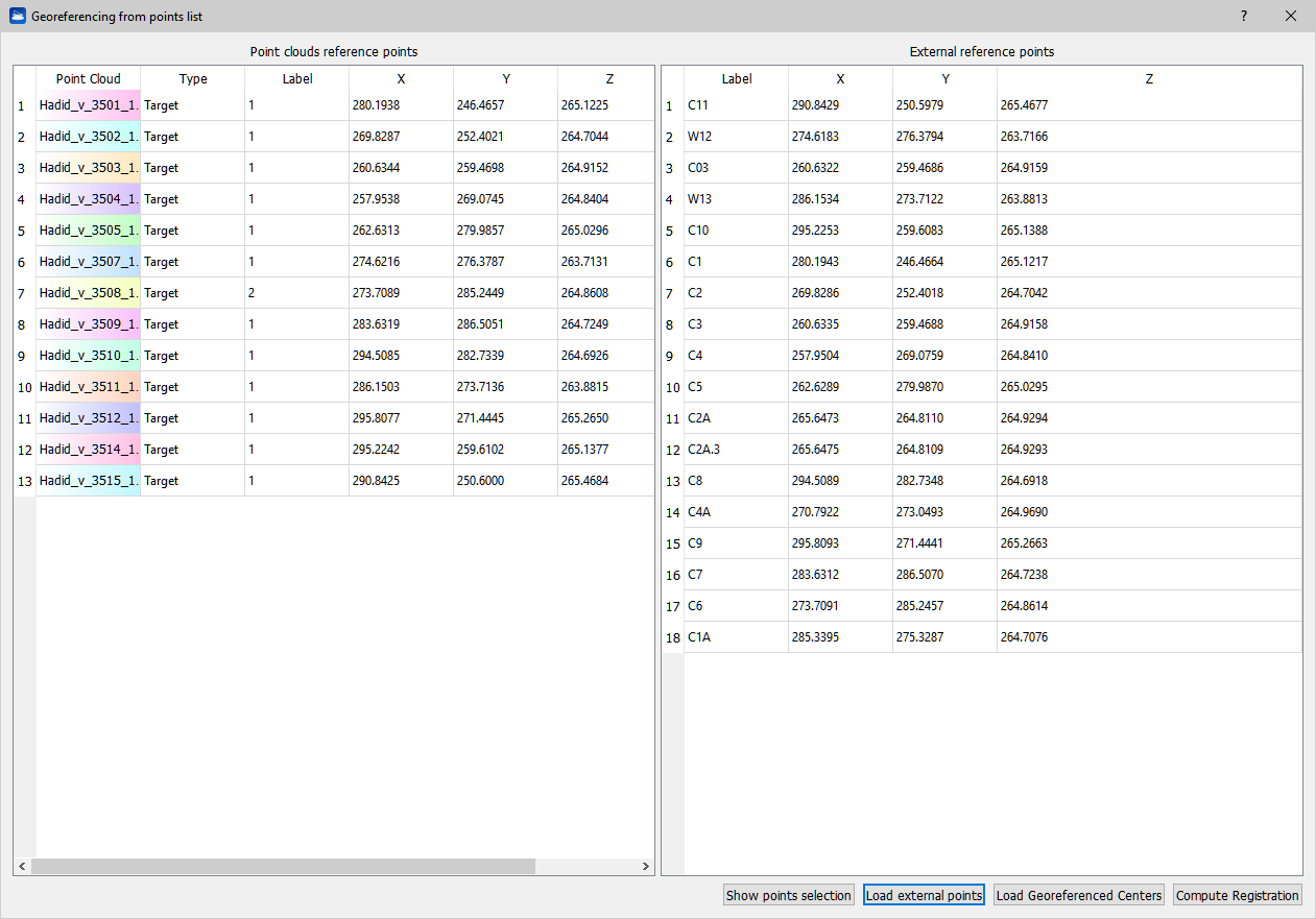 After the reference points selection, using Georeferencing from point list dialog allows you to Load external points (or Georeferenced Centers of the scans) to geo-reference scans by using previous selected target points.