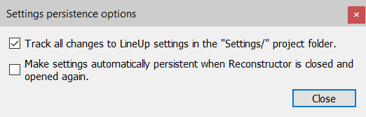 2. Flagging only the first option: the settings of the current Reconstructor® session are kept and the parameters are saved in the Settings folder (.xml) at each modification. Closing and reopening Reconstructor® the parameters return to default values, but keeping the possibility to load previously saved settings. Specific parameters can so be saved for each project.