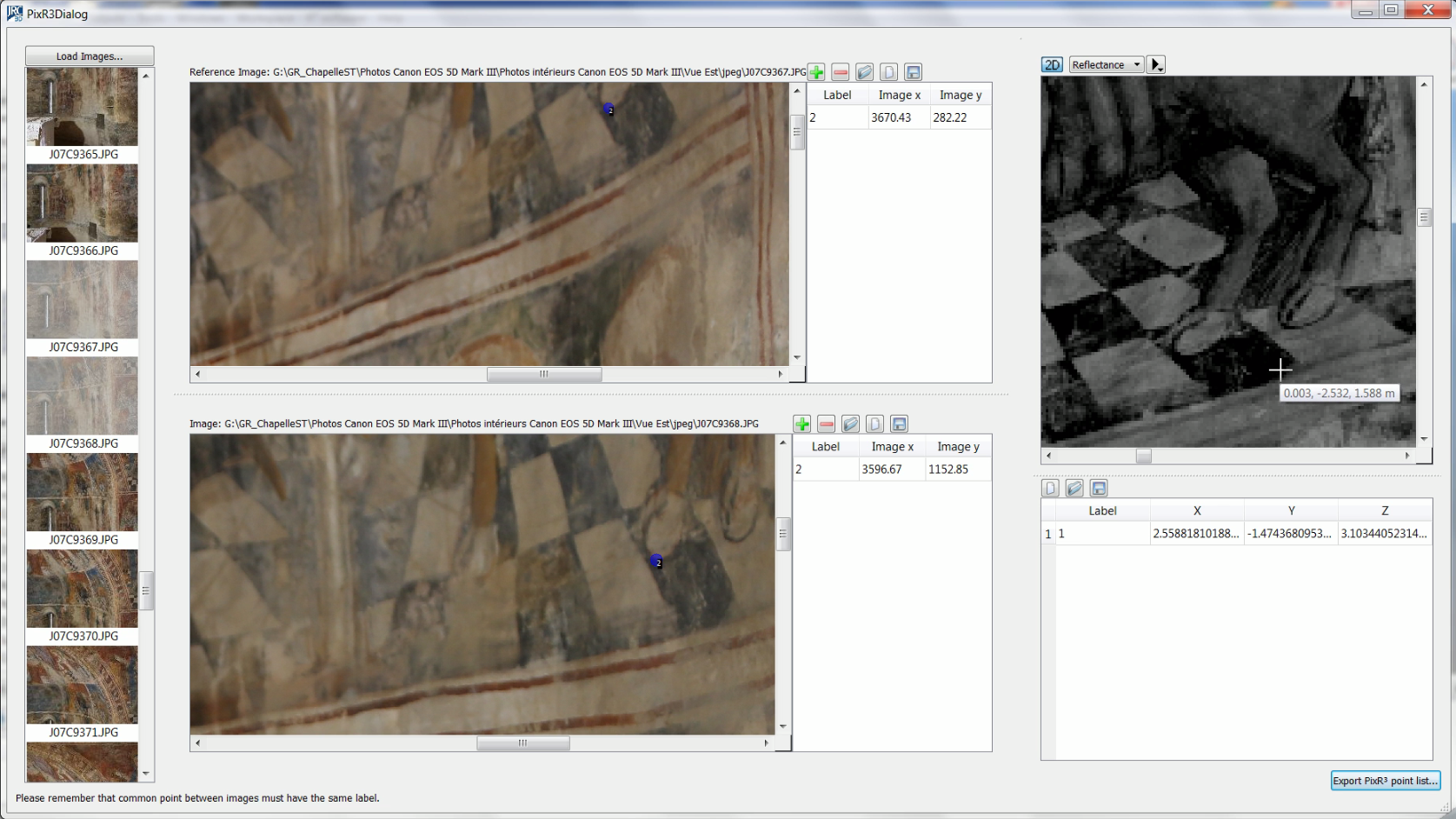 - Through the Export Zephyr Point List button export the coordinates of the control points. So you can automatically obtain two .txt file, one for the 2D (on pictures) coordinates one for 3D (on scans) coordinates.