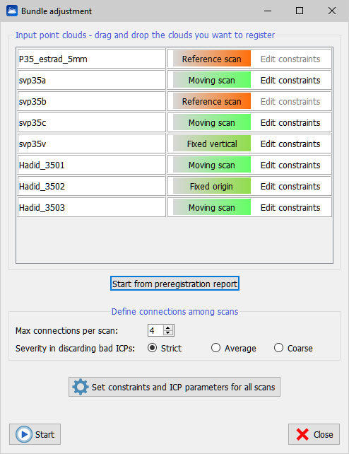 If you have previously performed the automatic preregistration of your scans, you can use the results of your preregistration in the bundle adjustment. Click Start from preregistration report and load the report of the automatic preregistration, a text file by default saved in the /Exports folder of your project. The dialog will show in the top list all the clouds that were automatically preregistered, and will adjust the ICP settings accordingly to the preregistration error contained in the report.