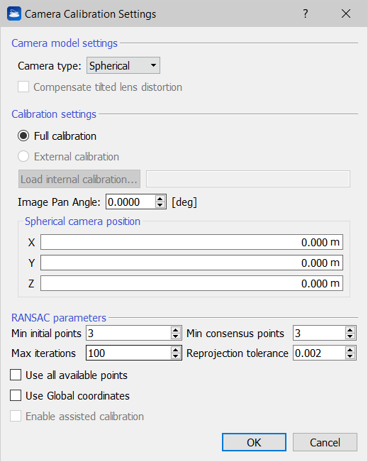 By clicking on Settings, a dialog including all the camera model/calibration settings and RANSAC parameters is opened: