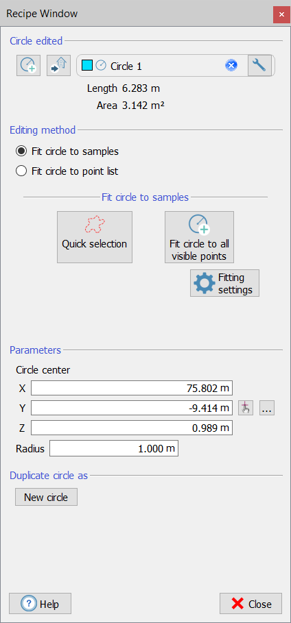 This is a toolbox for creating/editing a circle from samples or point list. Start by dragging and dropping in the editor window the circle you want to edit. If no circle is dropped, a new circle will be created when you activate any of the functions or when you click on Note that a circle could be created also as intersection between other shapes (see Intersect geometric shapes). In the upper part of the window the length and the circumscribed area are listed. |