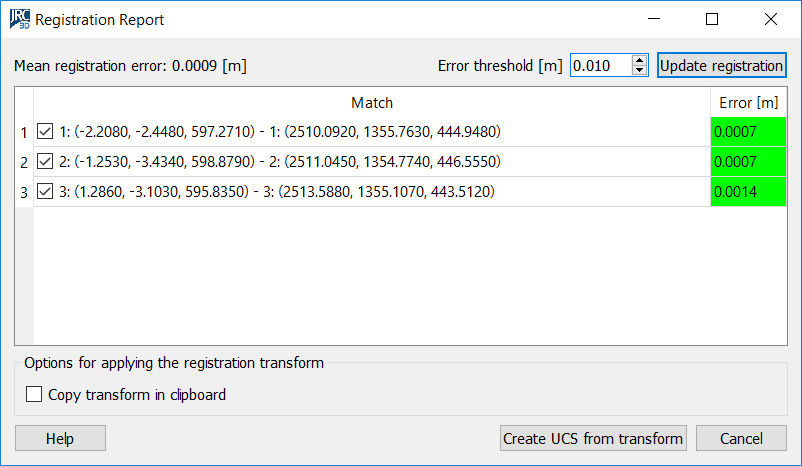 In the dialog above, it is possible to set the error threshold and to exclude outliers in order to improve the mean registration error. The way to do that is described in ICP Registration. Once you have refined the mean-squared error (shown on top left), press Create UCS from transform to create the desired UCS. The resulting UCS will be inserted in the project window.