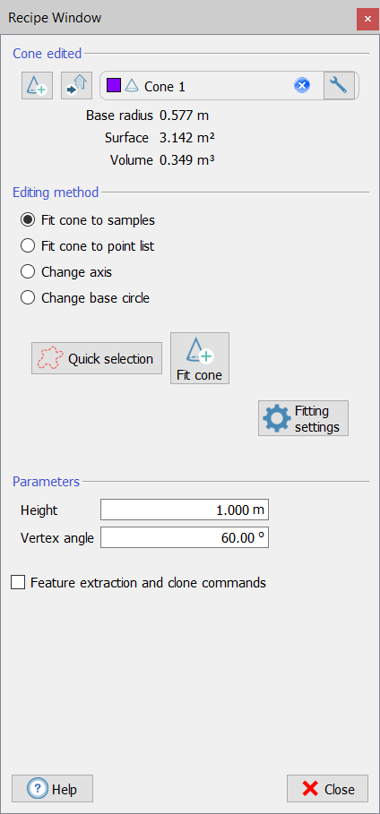 This is a toolbox for creating/editing a cone from samples, points, axis or circles. Start by dragging and dropping in the editor window the cone you want to edit. If no cone is dropped, a new cone will be created when when you activate any of the functions or when you click on In the upper part of the window the Base radius, the Surface and the circumscribed Volume are listed. |