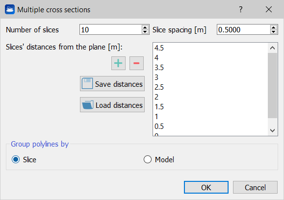 In the top left spinbox you can specify how many slices you want, the default is one. The top right spinbox allows you to specify the default inter-slice distance. By editing these two parameters, you will notice that the values in the panel on the right in the dialog are changing. These are the list of the slices' distances from the plane. By double-clicking on a single distance, it is possible to edit individually each distance. Furthermore, it is possible to add (green “plus” button) and remove (red “minus” button) the currently selected slice. There are also two buttons to Save the distances and Load the distances: these are useful when you have to use the same distances set for many cross sections.