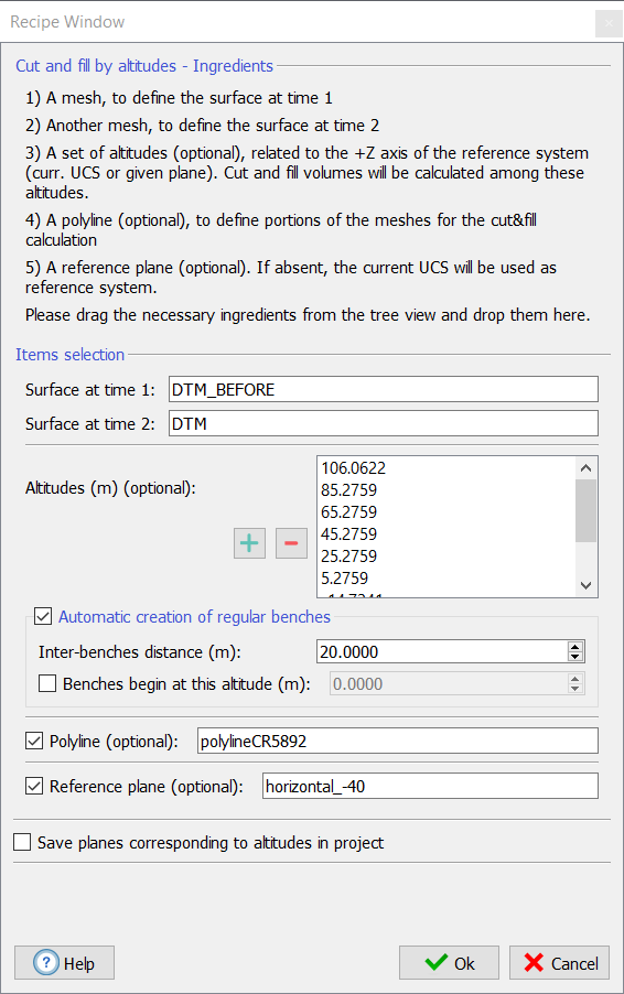 The simplest way to use this procedure is to drag in the recipe window one mesh representing the surface at time 1, another mesh representing the surface at time 2, and click OK. Reconstructor will return the volume of surface 1 integrated on the Z=0 plane of the current UCS, the volume of surface 2 integrated in the same way, the cut volume (by how much the surface was excavated between time 1 and time 2), and the fill volume (by how much the surface was filled (has gained volume) between time 1 and time 2).