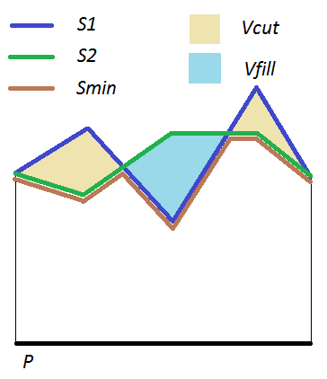 Given two surfaces S1 and S2, and a plane P, and assuming that the projections of S1 and S2 on P share a support C in common, a third surface Smin can be defined. Since each point in C, is the projection on P of (at least) one point of S1 and one of S2, the one of these points that is closest to P is defined as belonging to Smin. Let V1 be the integral of S1 on C, V2 the integral of S2 on C, andVmin the integral of Smin on C. Then the cut volume Vcut is given by V1 - Vmin, and the fill volume Vfill is V2 – Vmin. |