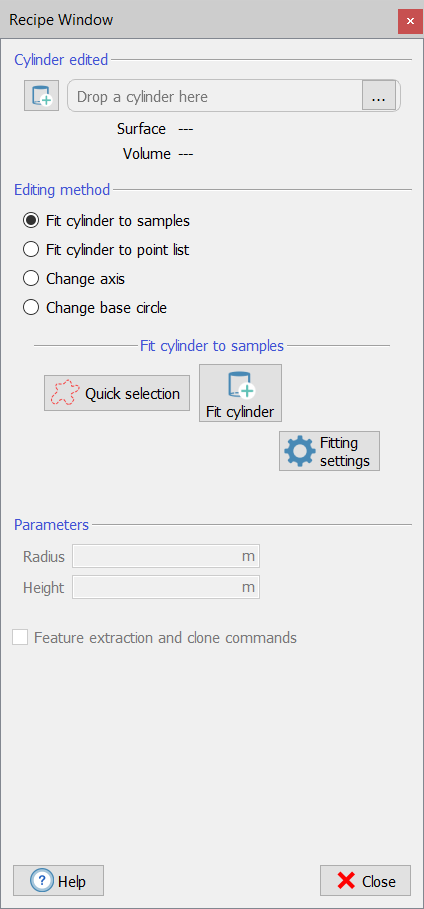 This is a toolbox for creating/editing a cylinder from samples, points, axis or circles. Start by dragging and dropping in the editor window the cylinder you want to edit. If no cylinder is dropped, a new cylinder will be created when when you activate any of the functions or when you click on In the upper part of the window the Surface and the circumscribed Volume are listed. |