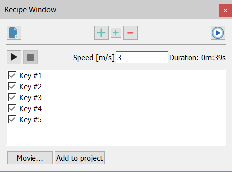 - Update trajectory: if at least 2 keys are defined, a temporary trajectory is computed for the checked keys (uncheck to skip the key) that can be simulated (Play from) or added to the project (Add to project)