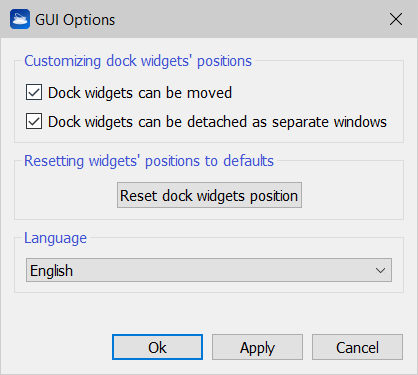 This dialog allows the user to change some GUI settings. The first two check boxes control how freely the dockable widgets can be moved around and detached. A reset button resets widgets' positions to a default setting. |