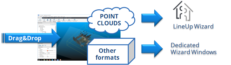 To quickly import data, just drag and drop the files you want to import anywhere in the 3D scene. A wizard will appear to ask you for import options, depending on kind of data.