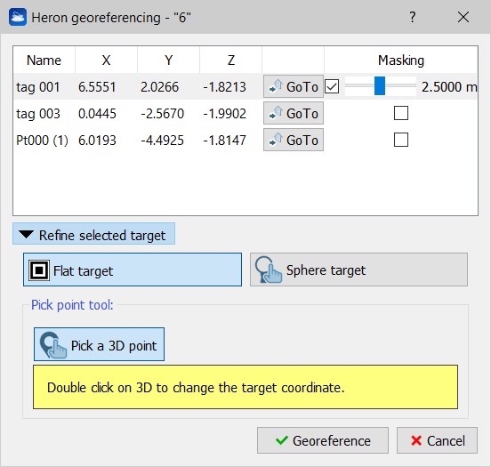 To refine the target position, identify it in the point cloud and double click (LMB) on its center to to define the new localization and to change the coordinates of the tags (as you will see in the table). |