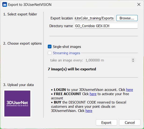 All the processes involve the export of the point clouds with the relative panoramic cameras (which must therefore be present in the Heron Survey), with the exception of 3DUserNet for which it is possible to export only the clouds (even without having the images).