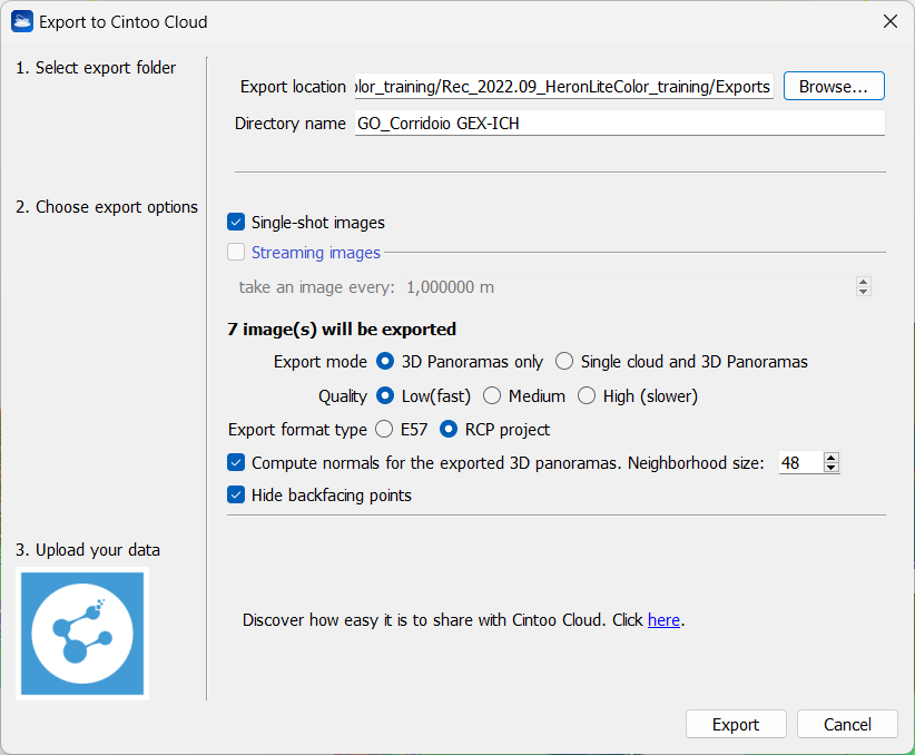 By this dialog you can set the structure and the quality of the data to be exported, as well as the export format: E57 or ReCap project. Once in Cintoo, have a look at the Cintoo Cloud User Guide to learn how to upload a Gexcel Heron data by importing this just exported object as structured scan. |