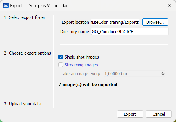 - In the same way, flag Streaming images to use panoramas acquired in continuous to extract a discrete number of panoramic views (setting their distance along the trajectory with "take an image every: ...") and create colored structured clouds.