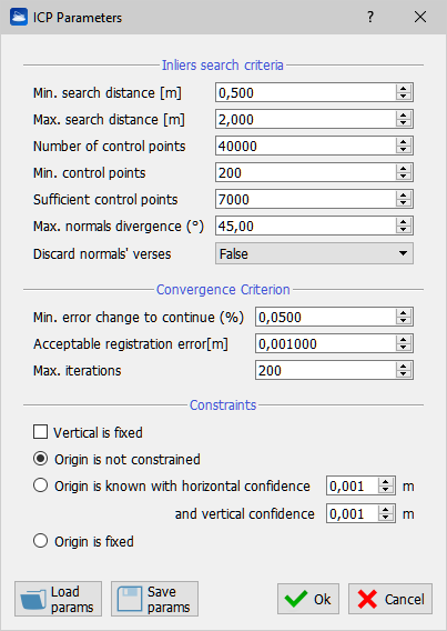 Once the reference and moving clouds are set, the user can also tune several parameters of the ICP algorithm, displayed in the Parameters box on top right of the dialog. The default parameters should work fine for most cases. However, here a full explanation of the ICP parameters is provided.