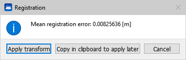 After finishing the registration, the dialog pictured above shows you the mean registration error and offers you three options: to immediately apply the registration to the moving grid, to copy the registration transform to clipboard to apply it later, or to cancel if you don't accept the error. You may want to copy the transform to the clipboard if you want to move more grids according to the same transform. This is useful for example if you have a group of say 10 grids already registered among them, to be registered against other 10 already registered among them.