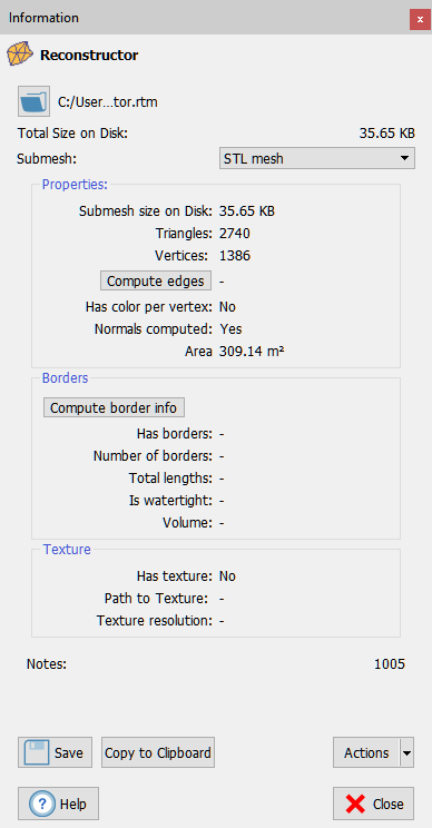 The information dialog includes general properties, points statistics, color and geometrical properties of the Reconstructor's items.