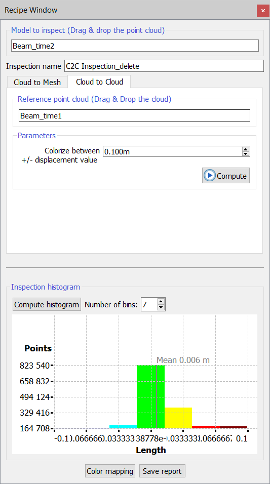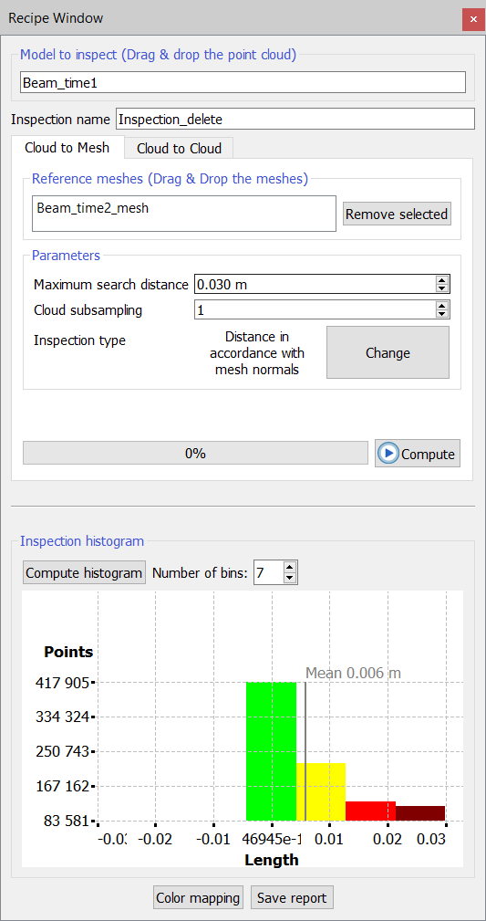 The result of the inspection is a new color layer that will be assigned to the point cloud to inspect. This color layer carries, for each point, its measured distance from the reference model. After performing Inspection tool it is possible to use the Colors mapping dialog function to map these measures with colors chosen by user and to see the corresponding color scale and histogram.