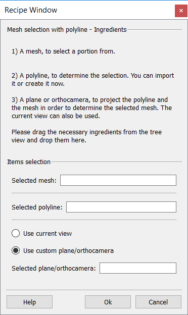 The 3D mesh selection works with an input mesh, a 3D polyline and a viewpoint that can be defined by an orthocamera, by a plane or by the current view. The polyline, seen by the input viewpoint, determines a frustum that intercepts the mesh defining a portion of it. This portion is acquired by doing Virtual scan, and uniformly meshing the resulting grid point cloud. The virtual scan is always done with an orthocamera that Reconstructor® creates internally. When selecting the polyline and the viewpoint, the user doesn't need to check whether the polyline is contained in the orthocamera's frustum, or how the polyline is positioned with respect to the plane. Reconstructor, in fact, creates an orthocamera whose frustum is automatically enlarged to include all the polyline. This automatic expansion, however, does not take into account the mesh (this is done to fully exploit the orthocamera's resolution on the selection region). The resolution of the internal orthocamera is calculated proportionally to the input mesh's vertices amount, so that the scanning is precise enough to preserve the input mesh's features. If a plane is given as input, Reconstructor® creates an orthocamera that points in the plane +Z direction. If the polyline and the mesh are in the -Z semispace, they will be included anyway in the selection because the orthocamera will have a negative near plane. However, the direction of the plane (or of the orthocamera) influences the winding direction of the mesh that results from the selection. |