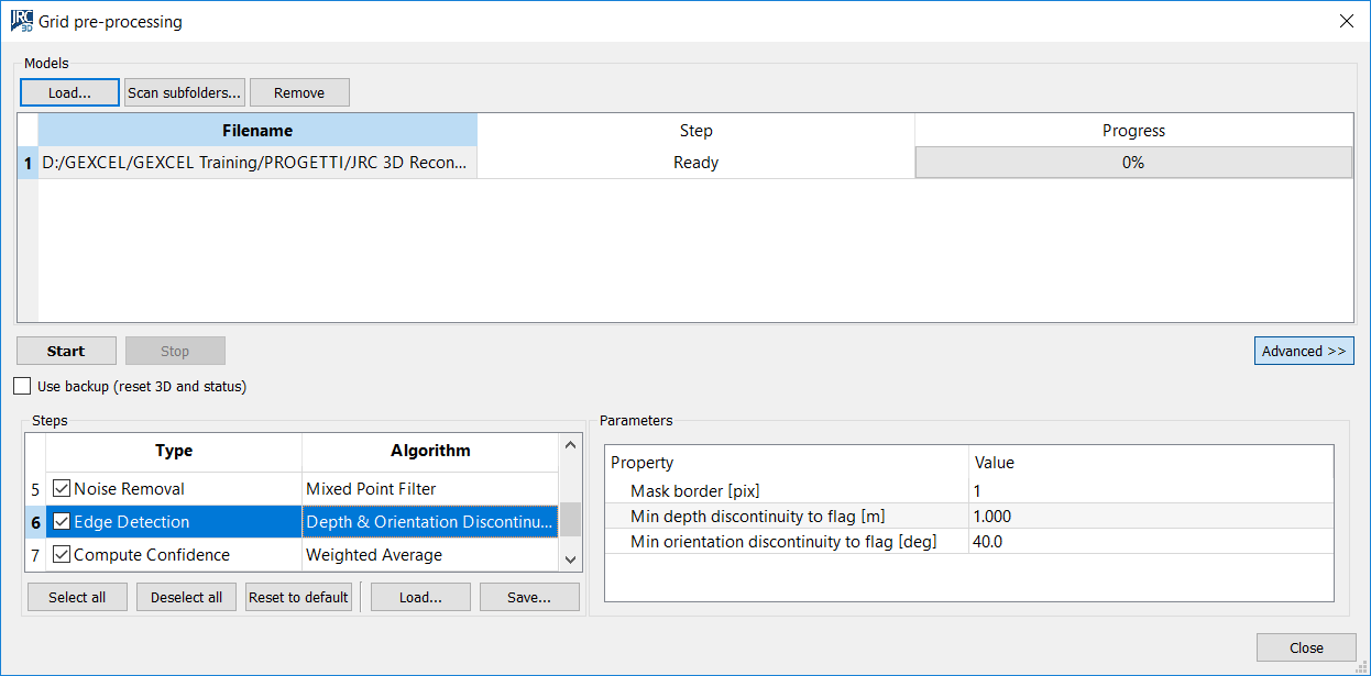 - It is possible to Save the meshing parameter and Load them for other scans or projects or Reset them to default values.
