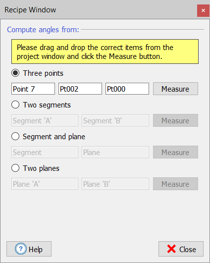 This function allows you to measure an angle between three points, two segments, a segment and a plane and between two planes. Drag and drop the objects mentioned above in the recipe window, then click on Measure button to take the measurement and automatically store it in the Survey tools list as a new Angle annotation including angle measure (e.g. 49.08 ° angle). |