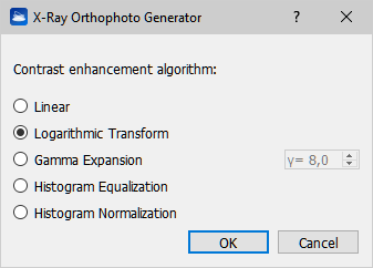 Select the desired contrast enhancement algorithm during the X-Ray Orthophoto generation. For the majority of cases the default (Logarithmic Transform) works well, feel free to try others too, specific for your needs. Press OK and wait a while.