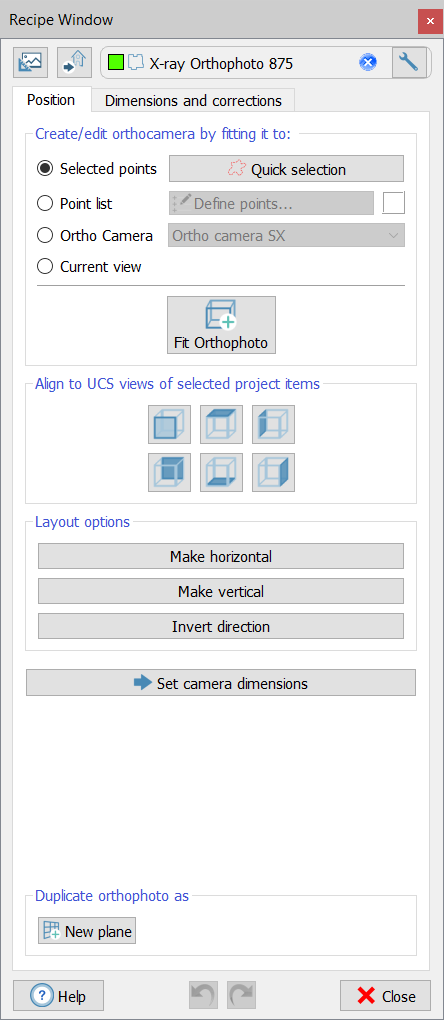 First of all, press the Create new The panel of the dialog allows you to create an orthocamera from selected samples and a Quick selection (as in Selection tools) or from a Point list. By pressing Fit Orthophoto button an orthophoto is created in 3D window and in the project tree. Then it's possible to edit the camera, aligning it to UCS views, making it horizontal or vertical... At the end of this process press Set camera dimension button to switch in the Dimension and Corrections panel.
