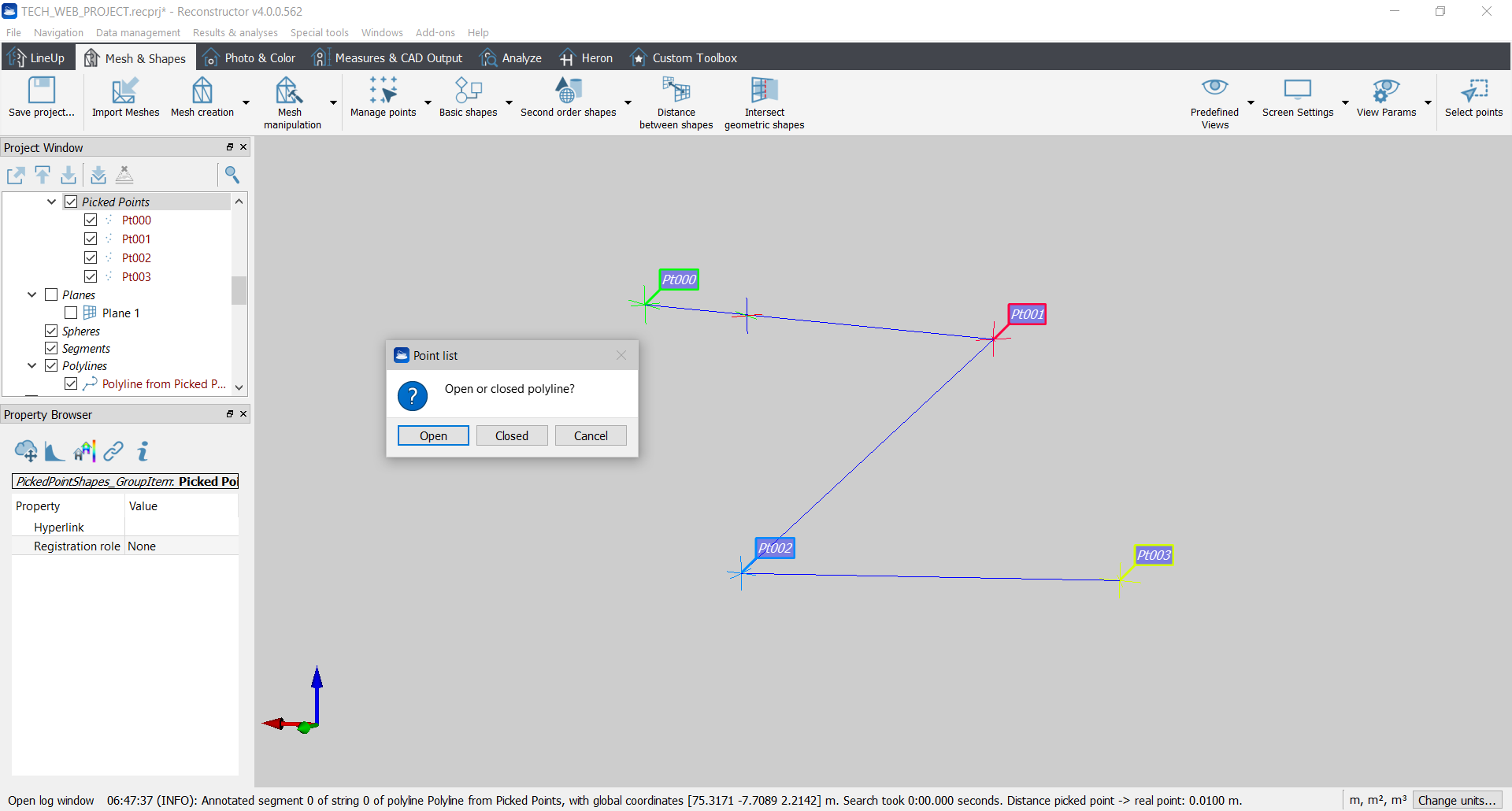 • If few points are selected (by pressing Ctrl button)  in the Project Window, before to select the Polyline from point list tool, only these selected points will be used