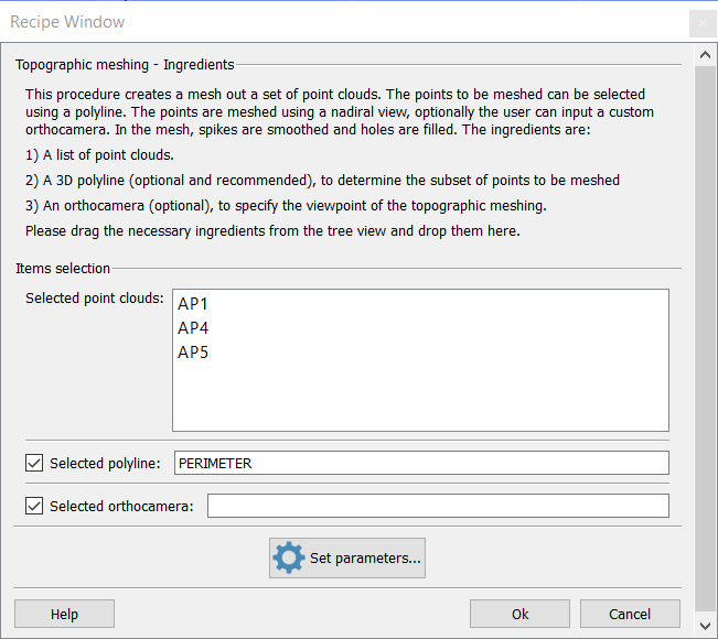 If the user doesn't specify any orthocamera, one is created so that it is nadiral (oriented towards -Z axis in the current UCS) and it contains the polyline. Once the user inputs the clouds and – optionally – the polyline, meshing starts by pressing Ok.