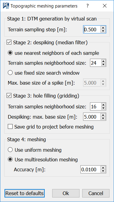 This dialog shows from top to bottom the four stages of the topographic meshing procedure. You can customize the parameters of each stage, and even decide to skip stages 2 and 3 by unchecking the respective boxes.