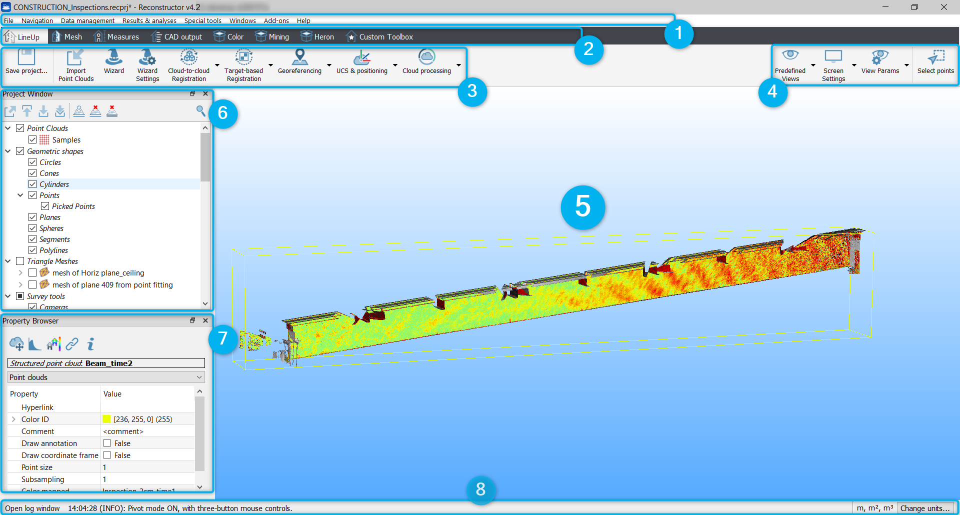 - The project window (dockable), which lists the objects that make the 3D scene (imported or created during the processing)